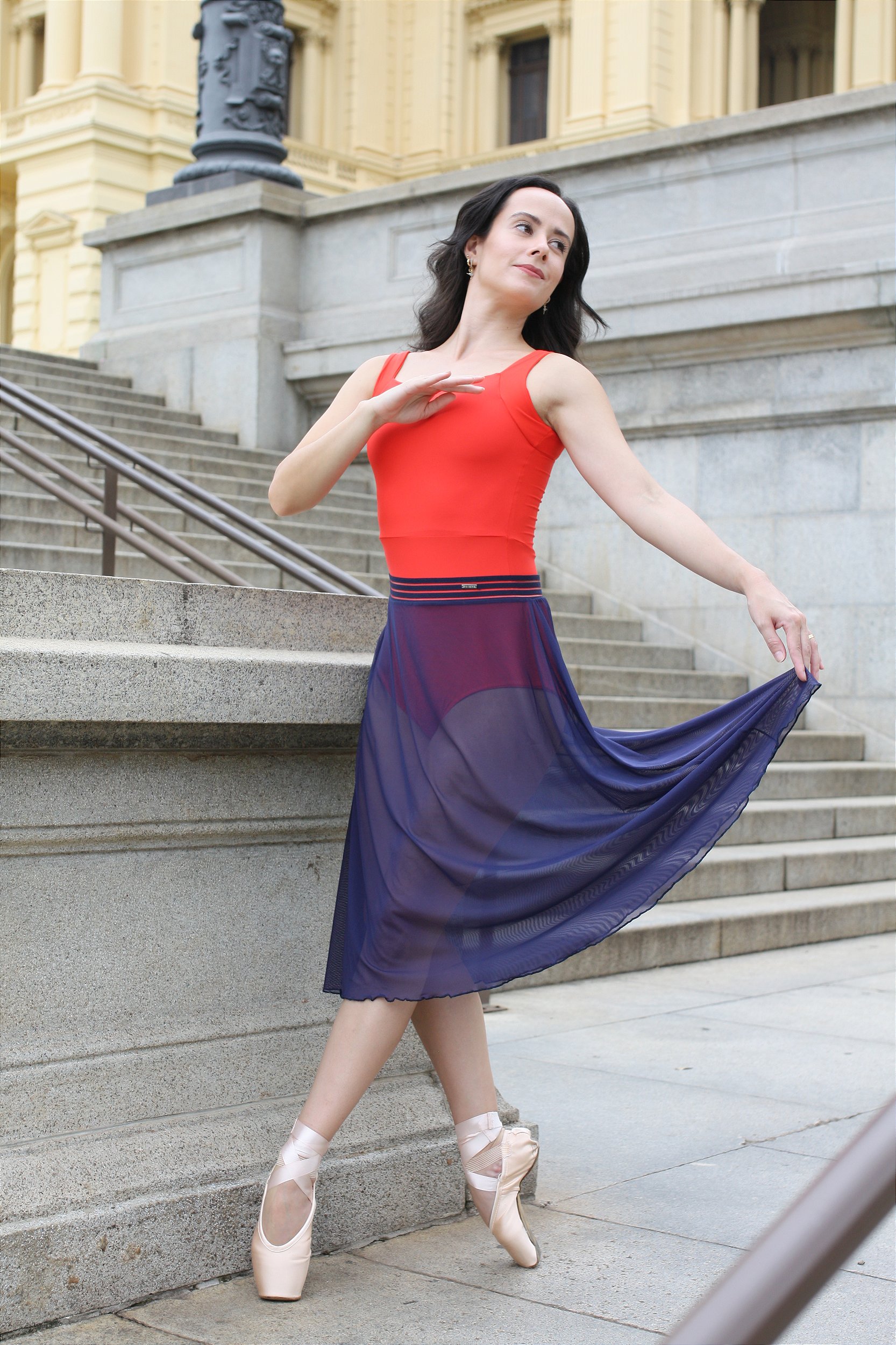 A Saia Gi possui corte godê, levemente franzida, de forma a proporcionar suavidade e lindas formas aos movimentos.